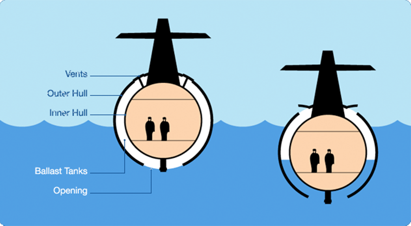 When the submarine is at the surface, its ballast tanks are filled with air, thus making its density less than that of the surrounding water. In order to submerge, the ballast tanks are filled with water, making the overall density of the ship higher than the surrounding water. When the submarine submerges in the water, compressed air is continuously supplied in order to support life inside it. Also, the air from the ballast tanks is pushed out with the help of pumps.
