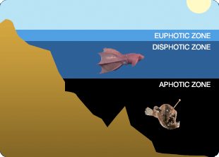 The next zone is the disphotic zone, which extends from about 50 meters, or wherever the euphotic zone ends, to about 1,000 meters. In this zone, there is enough light for organisms to see, but it is too weak for photosynthesis to happen. If we were to venture into the disphotic zone, we could watch the visible light disappear as we travelled deeper.